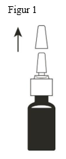 Hold flasken med tuppen opp og sett spraytuppen forsiktig inn i et nesebor.