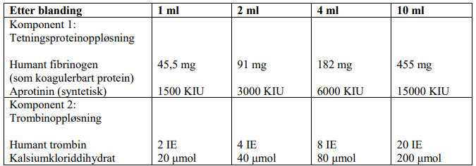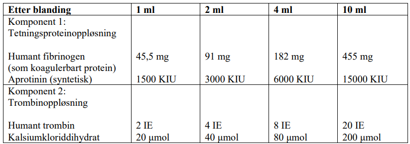 Virkestoff: Aprotinin, Fibrinogen, Kalsiumklorid, Trombin