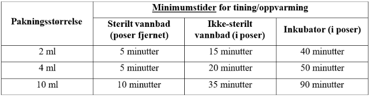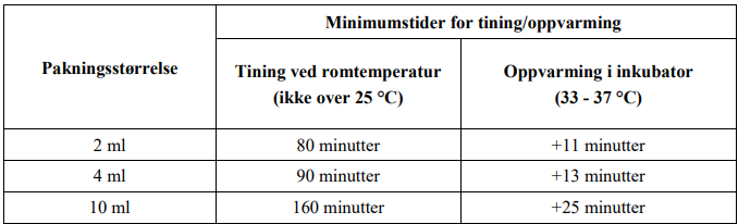 Tin den ferdigfylte sprøyten, pakket i begge posene, ved romtemperatur utenfor det sterile området (se tabell 3 for minimumstider for tining).