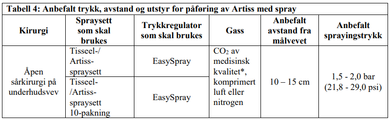 Ved påføring av Artiss med sprayutstyr må du sørge for å bruke et trykk og en avstand fra vev som er innenfor områdene som anbefales av leverandøren som følger: