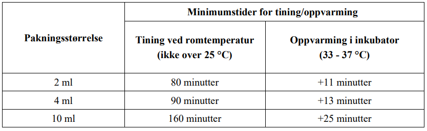Etter tining og oppvarming ved 33-37ºC (alternativ 1 og 2) må produktet brukes innen 4 timer.