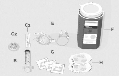 B. Kompatibel sprøyte C1. Overføringskanyle ELLER C2. Overføringsutstyr uten kanyle for å trekke opp produktet fra hetteglasset D. Infusjonssett (ikke vist; varierer avhengig av bruksanvisningen fra utstyrsprodusenten) E. Infusjonsslanger og Y-kobling (om nødvendig) F. Beholder for skarpt avfall G. Alkoholservietter H. Gasbind og teip, eller gjennomsiktig bandasje Figur 1 Eksempel på utstyr