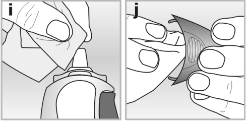 1. Tørk neseapplikatoren og innsiden av beskyttelseshetten med et rent, tørt papirtørkle - se bildene i og j.