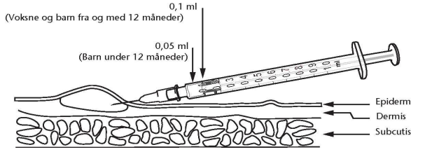 Den anbefalte dosen er 0.05 ml for barn under 12 måneder og 0.1 ml for voksne og barn fra og med 12 måneder.
