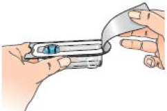 7 - Fjern blisterpakningen fra hetteglassadapteren mens du holder fast i kantene av blisterpakningen. Nå er du klar til å feste den ferdigfylte sprøyten med oppløsning til hetteglassadapteren.