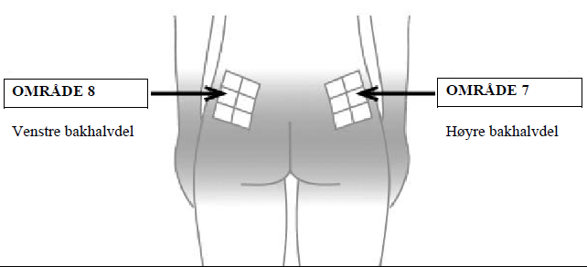 veksle injeksjonsstedene for hver injeksjon (se vedlegget ”Prosedyre for selvinjisering”, Del II, i den andre delen av dette pakningsvedlegget).
