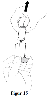 Steg 1: Ta trykkbeholderen ut av inhalatoren (se figur 15). Ikke rengjør trykkbeholderen eller la den bli våt.