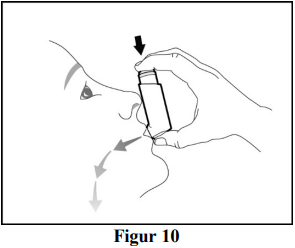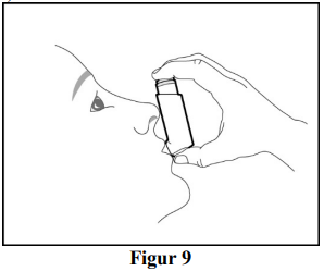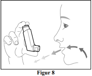 Steg 3: Hold inhalatoren med munnstykket pekende mot deg og pust ut gjennom munnen så dypt som du er komfortabel med (se figur 8).