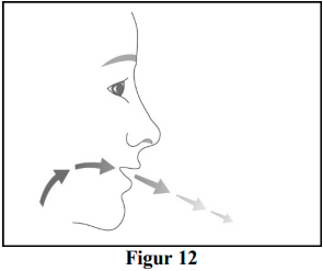 Steg 7: Pust forsiktig ut (se figur 12). Gjenta steg 2 til 7 for å ta din andre dose med Bevespi Aerosphere.