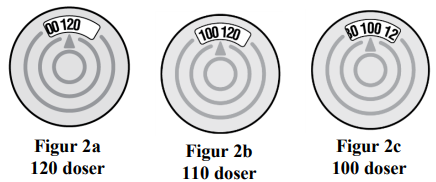 Pilen peker mellom 100 og 120 etter at du har tatt 10 doser til. Dette betyr at det er 110 doser legemiddel igjen i trykkbeholderen (se figur 2b).