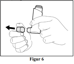 Fjern hetten fra munnstykket (se figur 3). Undersøk på innsiden av munnstykket før du bruker inhalatoren for å se at den er tom.