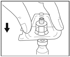 Trykk hardt ned inntil adapteren knepper på plass, med adapterspissen gjennom hetteglassproppen. La adapteren være festet til hetteglasset, fremdeles i den utvendige emballasjen.