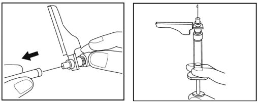 Snu hele enheten – hetteglass, adapter og sprøyte – med riktig side opp (med sprøyten øverst). Koble den fylte sprøyten fra adapteren ved å holde adapteren i én hånd og forsiktig snu sprøyten mot urviseren.