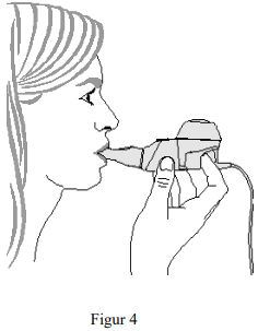 1. Begynn behandlingen din. Sitt i en avslappet, oppreist stilling. Hold munnstykket plant, plasser munnstykket i munnen og lukk leppene rundt det (figur 4).