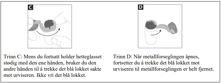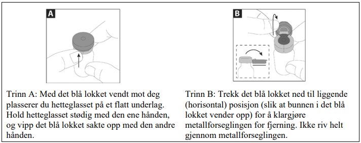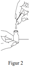 5. Åpne ampullen med oppløsningsvæske ved å vri av tuppen. Klem hele innholdet over i hetteglasset (figur 2). Deretter virvler du hetteglasset varsomt helt til pulveret er fullstendig oppløst og væsken er klar.