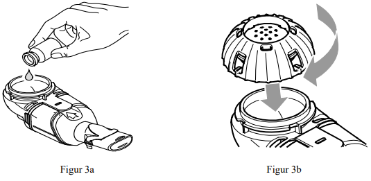 3. Hell all den tilberedte Cayston fra hetteglasset over i Altera forstøvermunnstykkets legemiddelbeholder (figur 3a). Sørg for å fullstendig tømme hetteglasset. Bank forsiktig hetteglasset mot siden av legemiddelbeholderen om nødvendig.