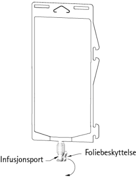 Fjern beskyttelsesfolien fra infusjonsporten og koble til det sterile administreringssettet. Heng posen på et infusjonsstativ.