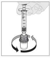 12. Med sprøyten fortsatt festet til adapteren og stempelstangen presset ned, roter hetteglasset forsiktig til pulveret er oppløst. Ikke rist.