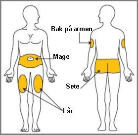 Lege, apotek eller sykepleier kan hjelpe deg med å bestemme hvor på kroppen du skal injisere dosen. Du kan også lese avsnittet “Velg injeksjonssted” i denne bruksanvisningen for å hjelpe deg med å velge hvilket område som kan virke best for deg.