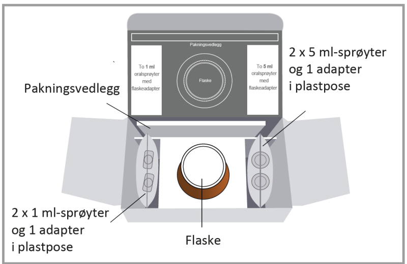 100 ml (1 × 100 ml flaske) med 2 × 5 ml og 2 × 1 ml kalibrerte oralsprøyter og to flaskeadaptere.