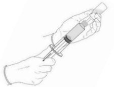 2. Fjern beskyttelseshetten fra sprøyten og ta vare på denne til senere bruk. Sett en kanyle som passer for rekonstituering på sprøyten. Hold sprøyten rett opp og press stempelet forsiktig oppover for å fjerne luft.
