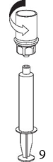 9. Nå når oppløsningen er overført til sprøyten, tar du et godt tak i sprøytesylinderen (hold sprøyten med stempelet nedover) og løsner det gjennomsiktige Mix2Vial-settet fra sprøyten ved å skru mot klokken.