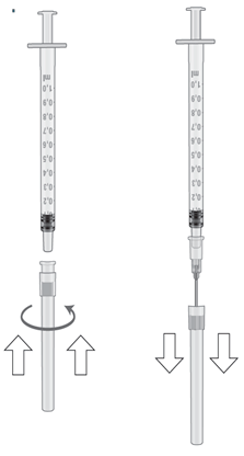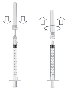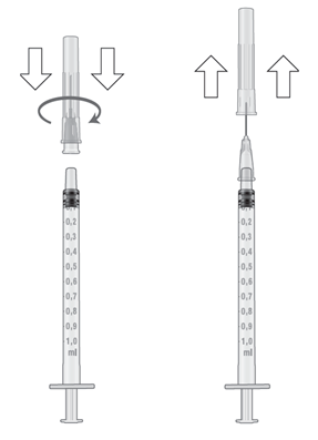 9. Hold sprøyten i øverste delen og hold den korte kanylen i beskyttelseshetten. Fest kanylen til sprøyten. Trykk og skru en halv omgang rundt i én retning inntil den sitter godt fast. Fjern deretter beskyttelseshetten.