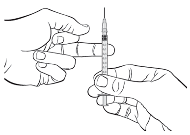 2. Grip sprøyten og hold den med kanylen vendt oppover. Dunk forsiktig på sprøytesylinderen inntil alle luftboblene beveger seg til toppen av sprøyten. Trykk stempelet forsiktig inn inntil noen få dråper kommer ut av kanylen. Dette gjøres for å hindre luft i kanylen.