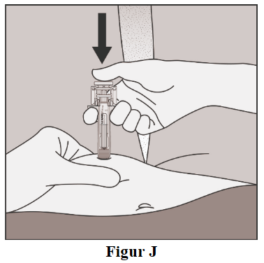 Skyv stempelet sakte inn og helt ned til all væsken er injisert, og sprøyten er tom (figur J). Merk: Stempelet må skyves helt ned for å være sikker på at hele dosen har blitt injisert og at nålebeskyttelsen vil bli aktivert.