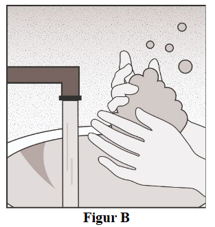 Vask hendene grundig med såpe og vann (figur B).