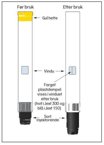 I inspeksjonsvinduet på etiketten vises et farget plaststempel (hvitt på Jext 300 og blått på Jext 150). Dette bekrefter at autoinjektoren er aktivert og at adrenalinløsningen er injisert.