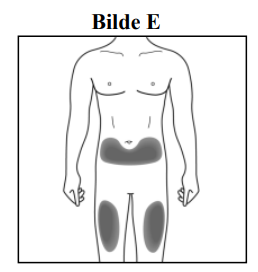 Anbefalt injeksjonssted er forsiden av lårene. Du kan også bruke nedre del av magen (buken), men ikke i et område 5 cm rundt navlen (se bilde E).