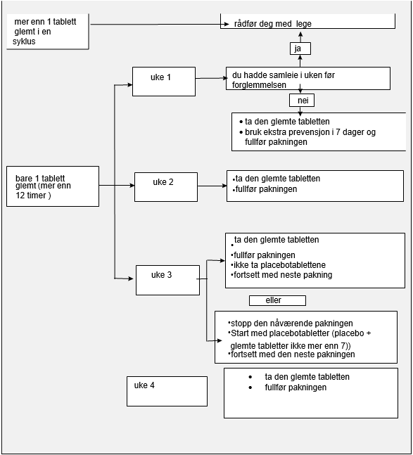 Dersom du er mer enn 12 timer for sent ute med å ta en tablett kan p-pillens sikkerhet være redusert. Jo flere tabletter du glemmer på rad jo høyere er risikoen for at den preventive effekten reduseres. Det er spesielt høy risiko for å bli gravid dersom du glemmer store (aktive) tabletter på begynnelsen eller i den tredje uken (uken før du begynner med de små tablettene). Derfor må du følge de reglene som angis nedenfor (se også diagrammet under).