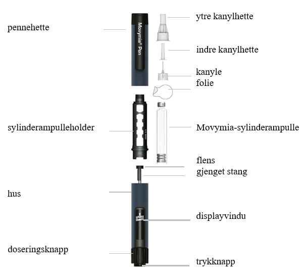 Movymia-sylinderampullene er designet for bruk sammen med det gjenbrukbare, flerdose- legemiddelleveringssystemet Movymia penn og kompatible kanyler. Pennen og kanylene følger ikke med Movymia. Det skal ved oppstart av behandlingen brukes en pakning som inneholder en indre kartong Movymia-sylinderampulle og en indre kartong Movymia penn.