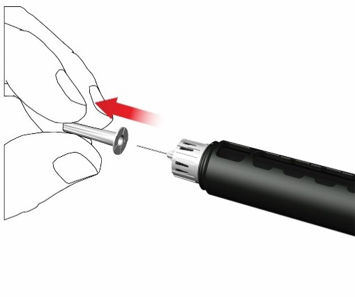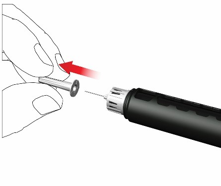 D: Skyv gjengestangen forsiktig med fingeren, i en rett linje og så langt som den går. Dette er ikke nødvendig når stangen allerede er i startposisjonen, for eksempel ved første bruk. Den gjengede stangen kan ikke skyves helt tilbake til pennhuset.