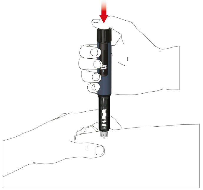 Hold en rengjort hudfold og sett kanylen rett ned i huden. Trykk på knappen og hold den inne til doseindikatoren har gått tilbake til startposisjon.