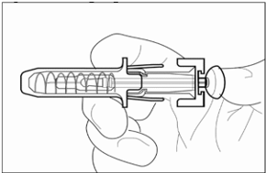 8. Ta nålehetten av sprøyten ved å holde rundt beholderen og trekke nålehetten forsiktig rett av og bort fra kroppen din uten å vri. Kast nålehetten. Du skal ikke sette nålehetten tilbake på sprøyten. Ikke skyv inn stempelet, og ikke berør nålen eller rist sprøyten.