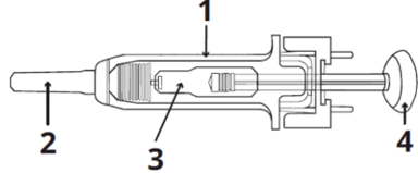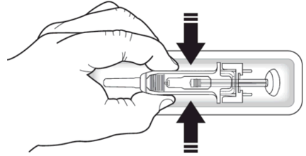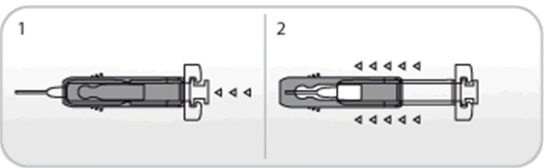 2. Skyv ned stempelet mens du holder i fingerflensen til hele dosen er satt. Den passive kanylebeskyttelsen vil IKKE aktiveres før HELE dosen er satt.