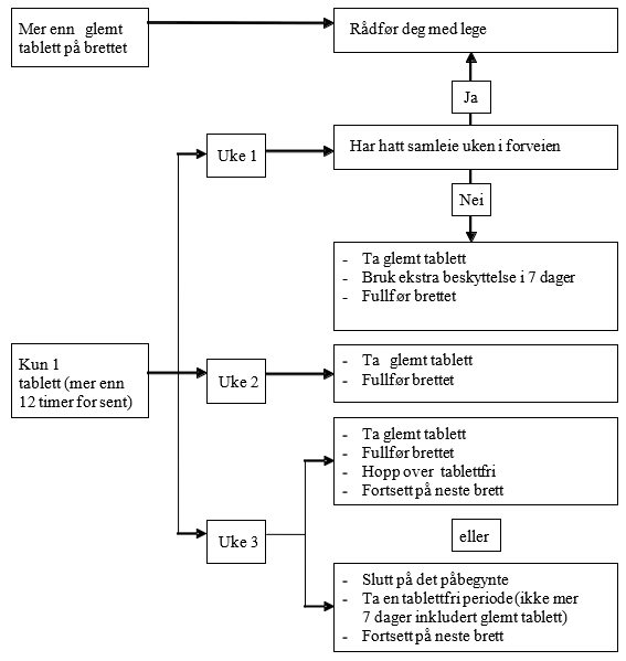 Dersom du har glemt noen av tablettene på et brett og ikke får en blødning i løpet av de tablettfrie dagene, kan du være gravid. Rådfør deg med legen din før du begynner på neste brett.