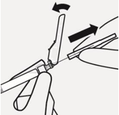 Trekk blisterposen opp halvveis, og bruk den til å ta tak i basen på nålen som vist. Mens du holder i den hvite kragen, festes sprøyten til nålens luerkobling med en bestemt vridende bevegelse med klokken til den sitter godt. Ikke ta på nålens lueråpning. Det vil føre til kontaminering.