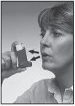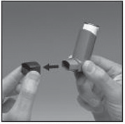 2. For å være sikker på at den virker, rist inhalatoren godt, hold munnstykket slik at det peker fra deg og trykk på beholderen for å frigjøre to doser i luften. Det samme bør gjøres dersom du ikke har brukt inhalatoren på 1 uke eller mer.