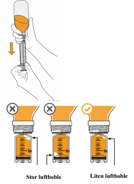 Hvis store luftbobler er synlige i sprøyten, som vist på bildene, skal legemidlet presses tilbake i flasken og dosen trekkes opp på nytt. Fortsett å gjøre dette inntil ingen store luftbobler er til stede. Små luftbobler er akseptable.