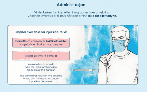 Vaksinene bør inspiseres visuelt for synlige partikler og misfarging før administrering.