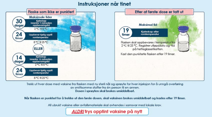 Hver ferdigfylte sprøyte er kun til engangsbruk. Vaksinen er klar til bruk etter opptining.