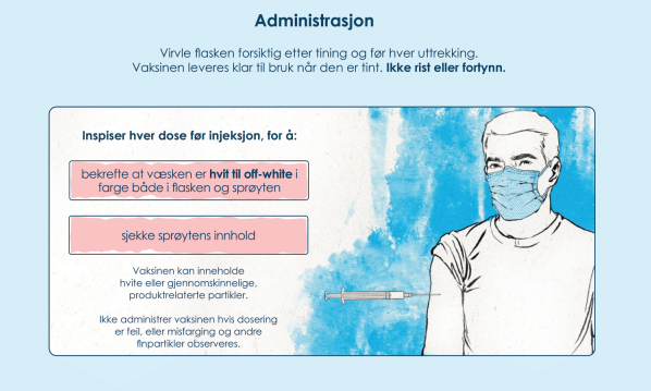 Vaksinene bør inspiseres visuelt for synlige partikler og misfarging før administrering.