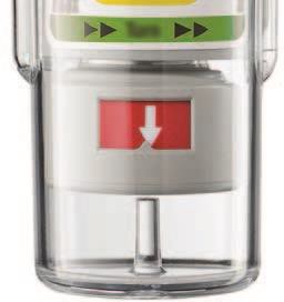 Er det gjennomsiktige endestykket løst og viser doseindikatoren på patronen en hvit pil på rød bakgrunn? Patronen er brukt opp. Sett inn en ny patron.