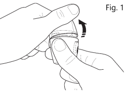 1. Fjern beskyttelseshetten Hold Vertical-Haler-inhalatoren og dra beskyttelseshetten oppover for å fjerne den fra underdelen og eksponere munnstykket som vist (Fig. 1). |