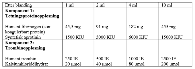 For å øke varigheten av koagelet og hindre for tidlig nedbryting er det tilsatt et syntetisk protein (syntetisk aprotinin).