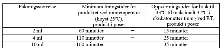 Minimum tinings-/oppvarmingstider 33°C til maksimalt 37 °C, sterilt vannbad Produkt uten poser