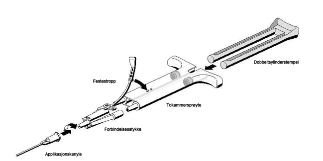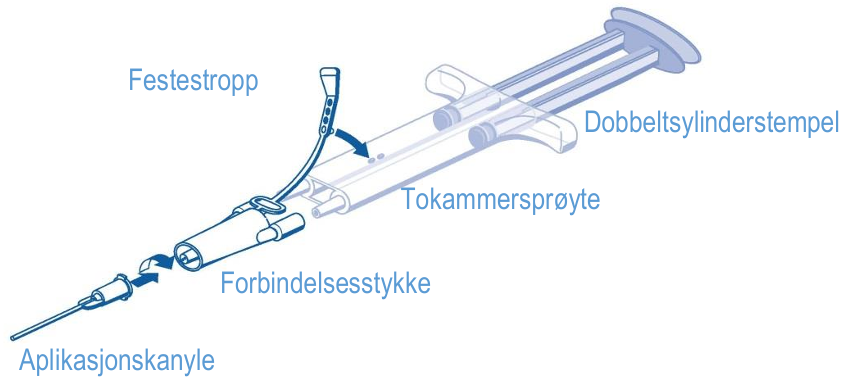 Fest forbindelsesstykket til den ferdigfylte tokammersprøyten med festestroppen.